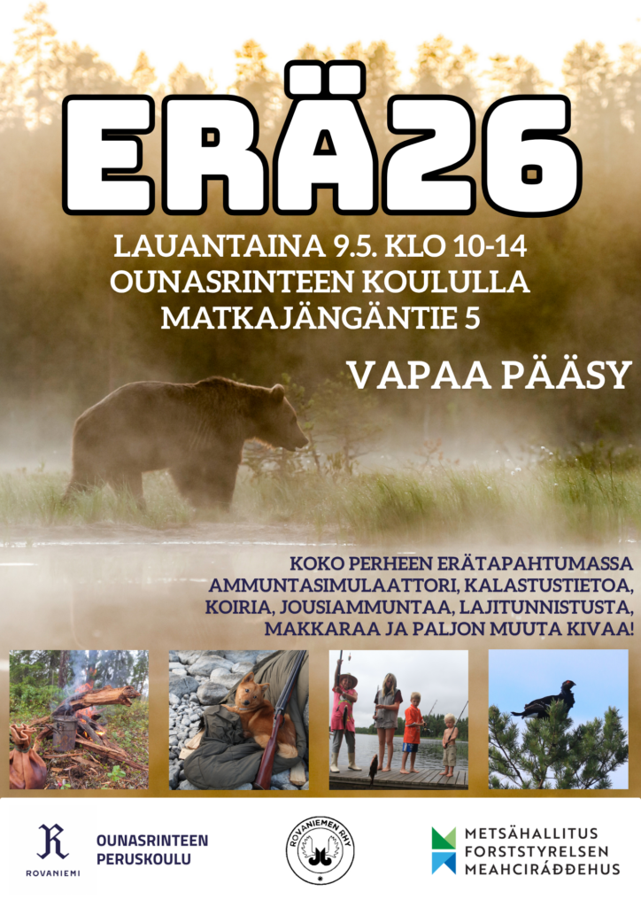 Tervetuloa koko perheen ERÄ26-tapahtumaan Ounasrinteen koululle (Matkajängäntie 5, Rovaniemi) lauantaina 9.5.2026 klo 10.00–14.00!